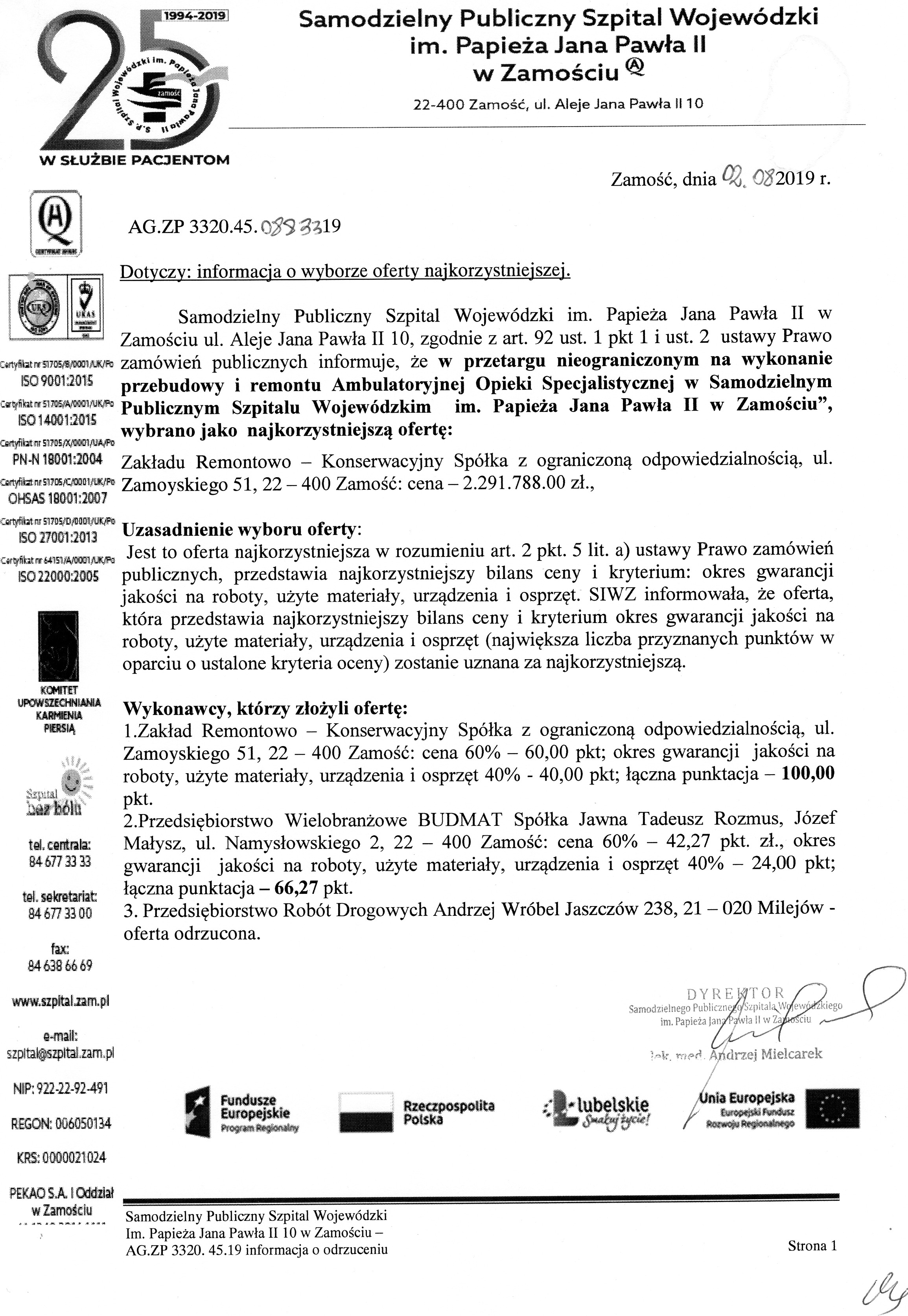 Wykonanie przebudowy i remontu pomieszczeń Ambulatoryjnej Opieki Specjalistycznej w Samodzielnym Publicznym Szpitalu Wojewódzkim im. Papieża Jana Pawła II w Zamościu.