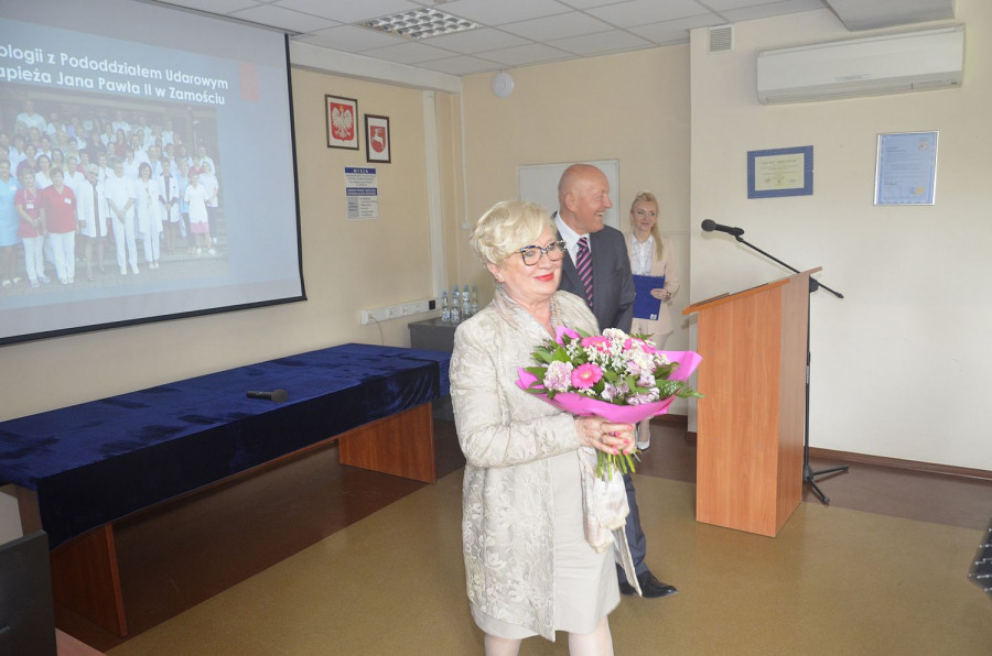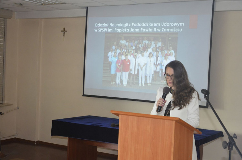 Po wystąpieniach okolicznościowych dr n. med. Ewa Wierzchowska-Cioch Lekarz Kierujący Oddziałem Neurologii z Pododdziałem Udarowym w swoim wystąpieniu przypomniała historię Oddziału, poinformowała o specyfice pracy w Oddziale, przedstawiła podległy personel oraz wskazała zakres działalności leczniczej Oddziału Neurologii z Pododdziałem Udarowym. Ponadto dr n. med. Ewa Wierzchowska-Cioch mówiła o poczynionych staraniach, uzyskanym wsparciu i pomocy oraz sukcesach dotyczących przebudowy i modernizacji Oddziału Neurologii z Pododdziałem Udarowym. Jednocześnie złożyła podziękowania za włożony trud i pracę wszystkim, którzy zaangażowali się w realizację inwestycji pod nazwą zadania: „Modernizacja Oddziału Neurologii z Pododdziałem Udarowym i wczesną rehabilitacją poudarową wraz z ambulatoryjną opieką specjalistyczną w celu wykonywania innowacyjnych procedur medycznych dla pacjentów Samodzielnego Publicznego Szpitala Wojewódzkiego im. Papieża Jana Pawła II w Zamościu.”