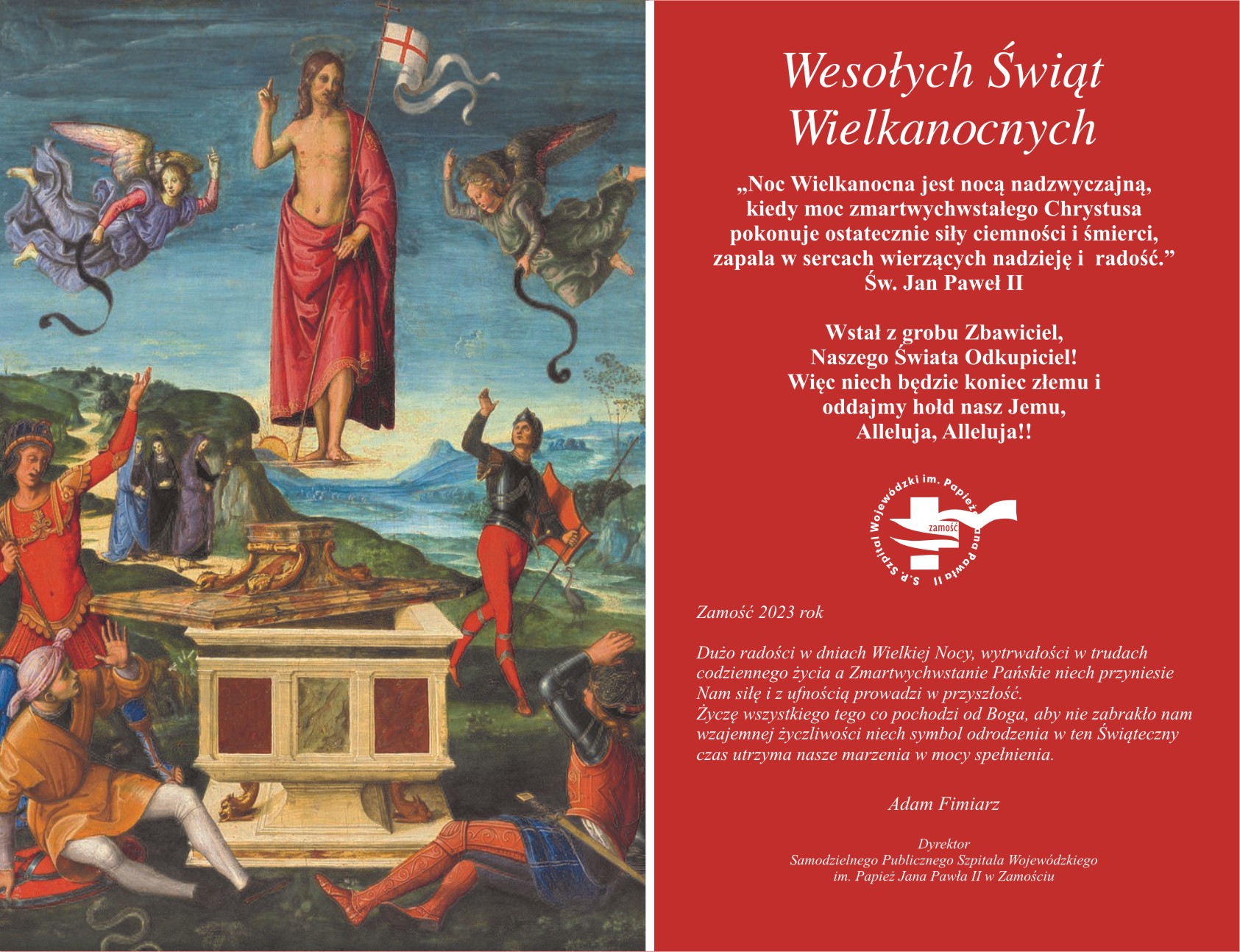 Dużo radości w dniach Wielkiej Nocy, wytrwałości w trudach codziennego życia a Zmartwychwstanie Pańskie niech przyniesie Nam siłę i z ufnością prowadzi w przyszłość. Życzę wszystkiego tego co pochodzi od Boga, aby nie zabrakło nam wzajemnej życzliwości niech symbol odrodzenia w ten Świąteczny czas utrzyma nasze marzenia w mocy spełnienia. Adam Fimiarz Dyrektor Samodzielnego Publicznego Szpitala Wojewódzkiego im. Papież Jana Pawła II w Zamościu