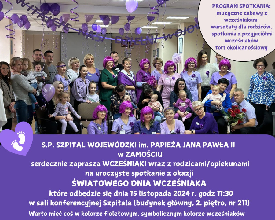 S.P. Szpital Wojewódzki im. Papieża Jana Pawła w Zamościu, Serdecznie zaprasza wcześniaki wraz z rodzicami/opiekunami na uroczyste spotkanie z okazji ŚWIATOWEGO DNIA WCZEŚNIAKA, które odbędzie się dnia 15.11.2024 o godz. 11:30, budynek główny Szpitala II piętro, sala 211.