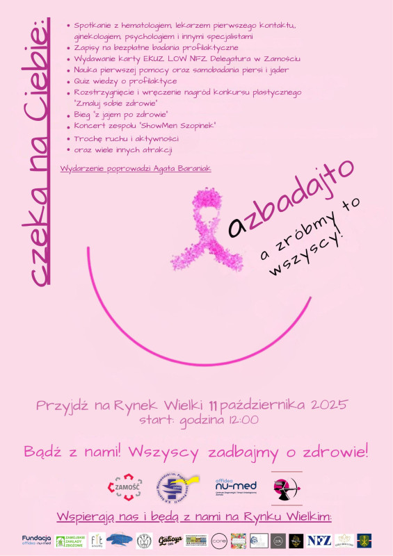 W sobotę, 11 października 2025 roku, Rynek Wielki w Zamościu stał się przestrzenią poświęconą zdrowiu, profilaktyce i integracji mieszkańców. Tego dnia odbył się finał trzeciej edycji akcji „A zbadaj to! A zróbmy to wszyscy”, której celem jest promowanie badań profilaktycznych, wczesnego wykrywania chorób nowotworowych u kobiet, oraz zdrowego stylu życia.